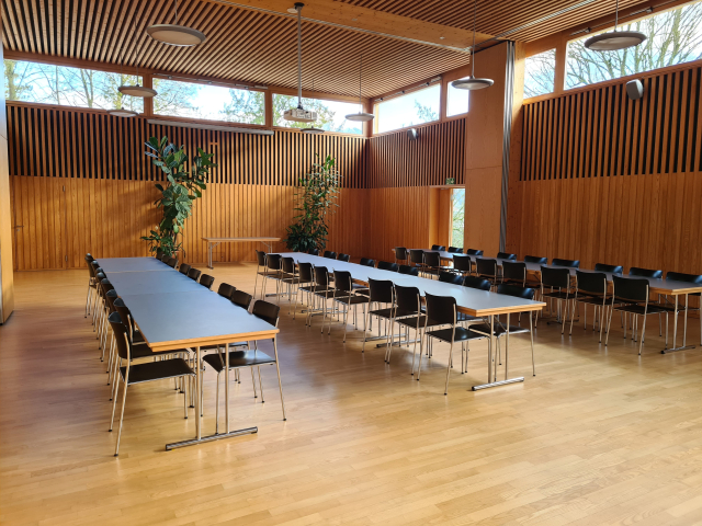 Das Pfarreizentrum befindet sich im Nebengebäude. Es eignet sich optimal für Veranstaltungen bis zu 150 Personen und ist somit perfekt für Hochzeiten, Konferenzen und andere Events. Das Catering für sämtliche Anlässe im Saal wird durch den Peterhofs durchgeführt.